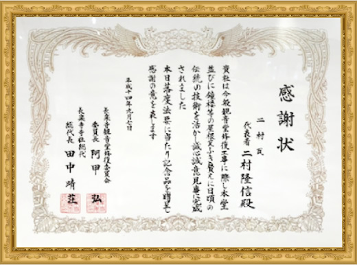 当社は国や県が発行している屋根の国家資格を持つ雨漏れ修理のプロです。長年の経験から、管理や技術に厳しい神社の修理も多数しており、おかげ様でテレビで紹介されました。
